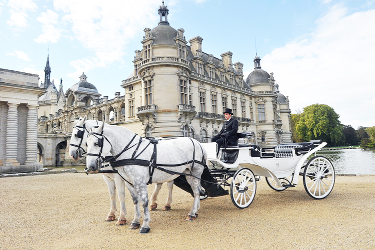 理想のフォトウェディングが記念に残る馬車に乗って撮影できます。シャンティィ城庭園の中でも、またパリ市内のエッフェル塔~シャンゼリゼ通り~凱旋門まで人生に1度の馬車フォトウェディングが可能です。