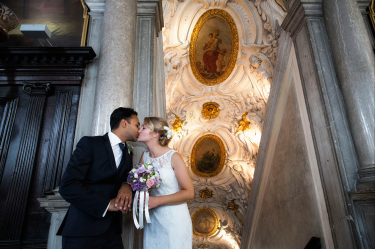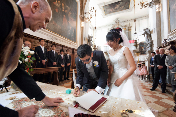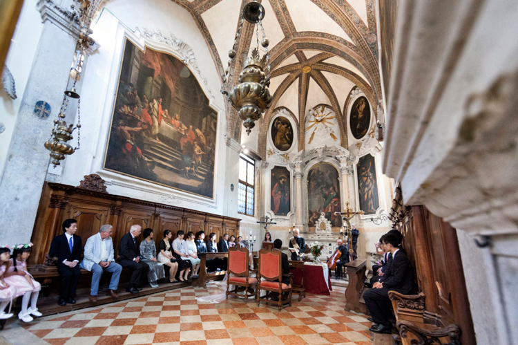 ヴェネチアのドルソドゥーロ地区ある「サン・ジョバンニ・エヴァンジェリスタ教会」。石造りの外観とは対照的に室内は驚くほど優美で、祭壇には大理石や銀細工、水晶が施されています。17世紀半ばに完成した2階部分には、巨匠ティエポロによる天井画が。バイオリンとチェロによる生演奏の中、荘厳でありながら華やかな挙式がかないます。ホテルから会場へ水上タクシーで向かえることも、水の都・ヴェネチアならでは。ゴンドラを利用したフォトツアーもステキ。ヴェネチアの風景に溶け込む幸せなふたりの姿を、思い出に残して。