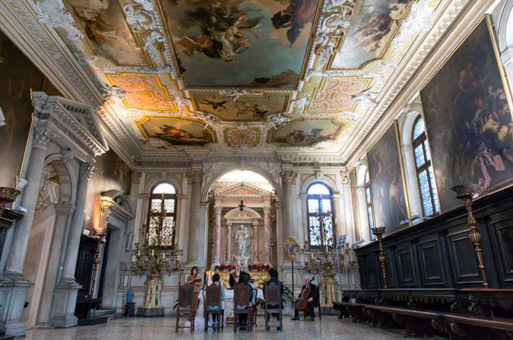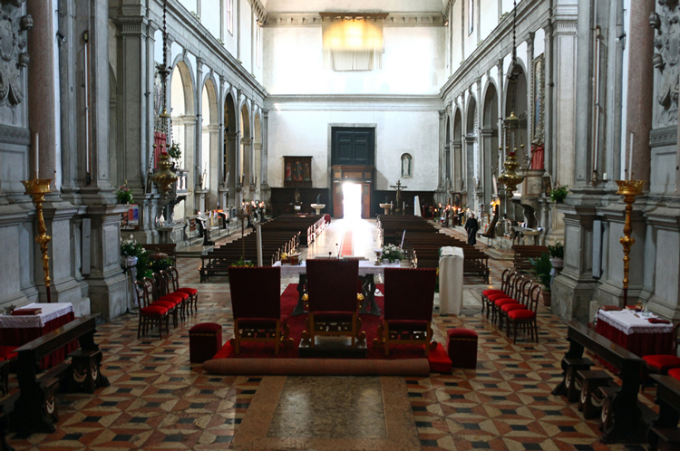 ヴェネツィア中心部に近いパッラーディオ建築の教会。白い大理石の教会内に飾られた壮麗な彫刻、42mものヴァージンロードには心を揺さぶられます。